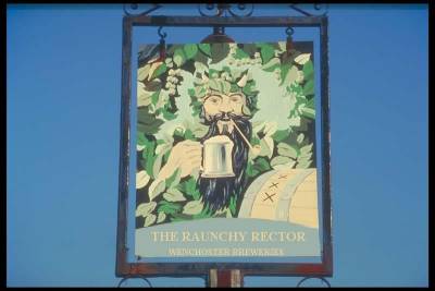THE RAUNCHY RECTOR in Twopenny Weasel is named after the Reverend Winston Tyckle (1802-1895) who combined traditional Prayer Book worship with bacchanalian romanticism. Close to Old Roger's Cottage (National Trust) on Rough Ride Road. Copper spittoons. Wenchostershire's largest selection of potato crisps. Outside privy. Old Roger's Stout on draught. Dogs Welcome.