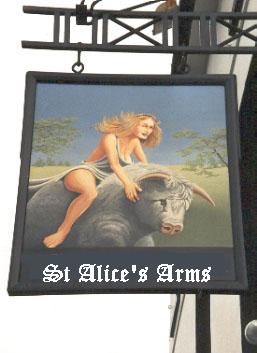 ST. ALICE'S ARMS is situated next to the parish church of St. Alice the Hapless (Samaritan Freephone in Belfry) on Broadwench Lane.  Plush lounge bar with velveteen chairs.  Luncheon sandwiches.  Selection of local chutneys.  French-style toilets.  Bishop's Topple on draught.  Bingo on Tuesday nights.  Karaoke on Thursday nights.