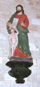 Between the windows is a semi-circular niche containing a marble bust of “Preacher Piecrust” whose evangelical preaching in the city restored the fortunes of the cathedral in the mid-18th century. Over the east door is a statue of St. Ennodius and his student, Ganndolfus "Ganny" Mead (see right). The student's state of undress has given rise to many theories over the relationship between master and student, but current thinking is that the image portrays the baptism of Ganny which took place when he was five years of age. The stone fireplace is partly copied from one of the stalls in the cloisters, and the old basket grate is believed to have belonged to Bishop Crackling who was killed in the Great Fire of London in 1666, being trapped in strange lodgings. Either side of the fireplace lie two cannon balls which are said to have been used at the siege of the city in 1644. On the mantelpiece is the death mask of Bishop Jolyon Cornerhouse who, as the infamous “French Tulip” was active in France during the Revolution. Below one of the windows stands a glass case containing the last suit of clothes worn by Bishop Passiondale who died at Ypres in 1918. Round the cornice are painted scenes from the life of Saint Ennodius that date from 1752. |